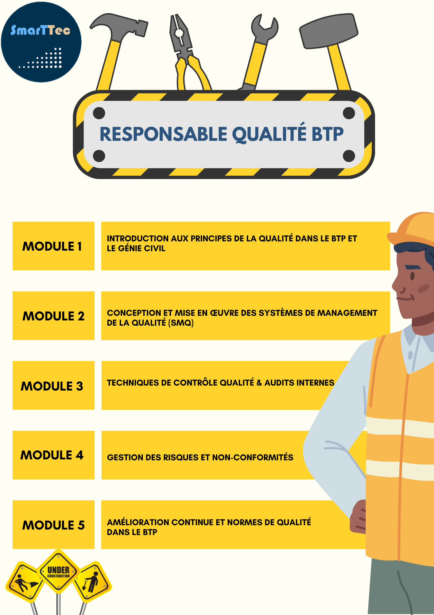 Cette formation est conçue pour former les professionnels à gérer, contrôler et améliorer la qualité dans le secteur du BTP, en mettant l'accent sur la conformité, la gestion des risques, la mise en place des meilleures pratiques et l'amélioration continue des processus qualité. Les objectifs incluent l'audit qualité, la gestion des non-conformités, la gestion des risques, ainsi que la promotion de la performance organisationnelle en matière de qualité.