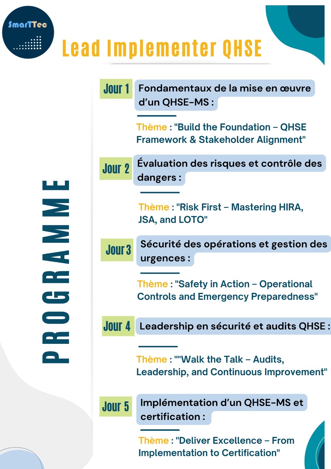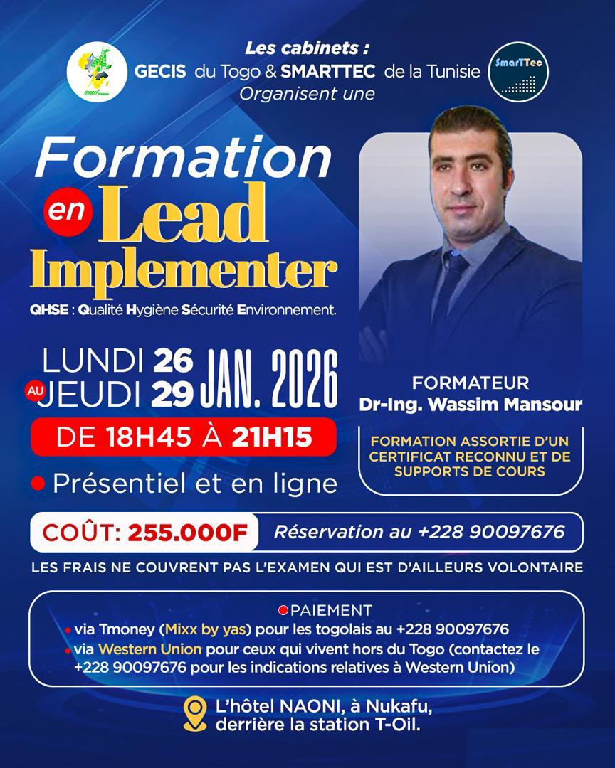 Le cabinet GECIS du Togo, en partenariat avec SMARTTEC de Tunisie, organise une formation certifiante Lead Implementer QHSE, axée sur les trois normes essentielles du management intégré : ISO 9001 (Qualité), ISO 14001 (Environnement) et ISO 45001 (Santé et Sécurité au Travail). Cette formation vous permettra de maîtriser les exigences et la mise en œuvre de ces référentiels pour assurer une gestion efficace des systèmes QHSE au sein des organisations. Encadrée par Dr.-Ing. Wassim Mansour .