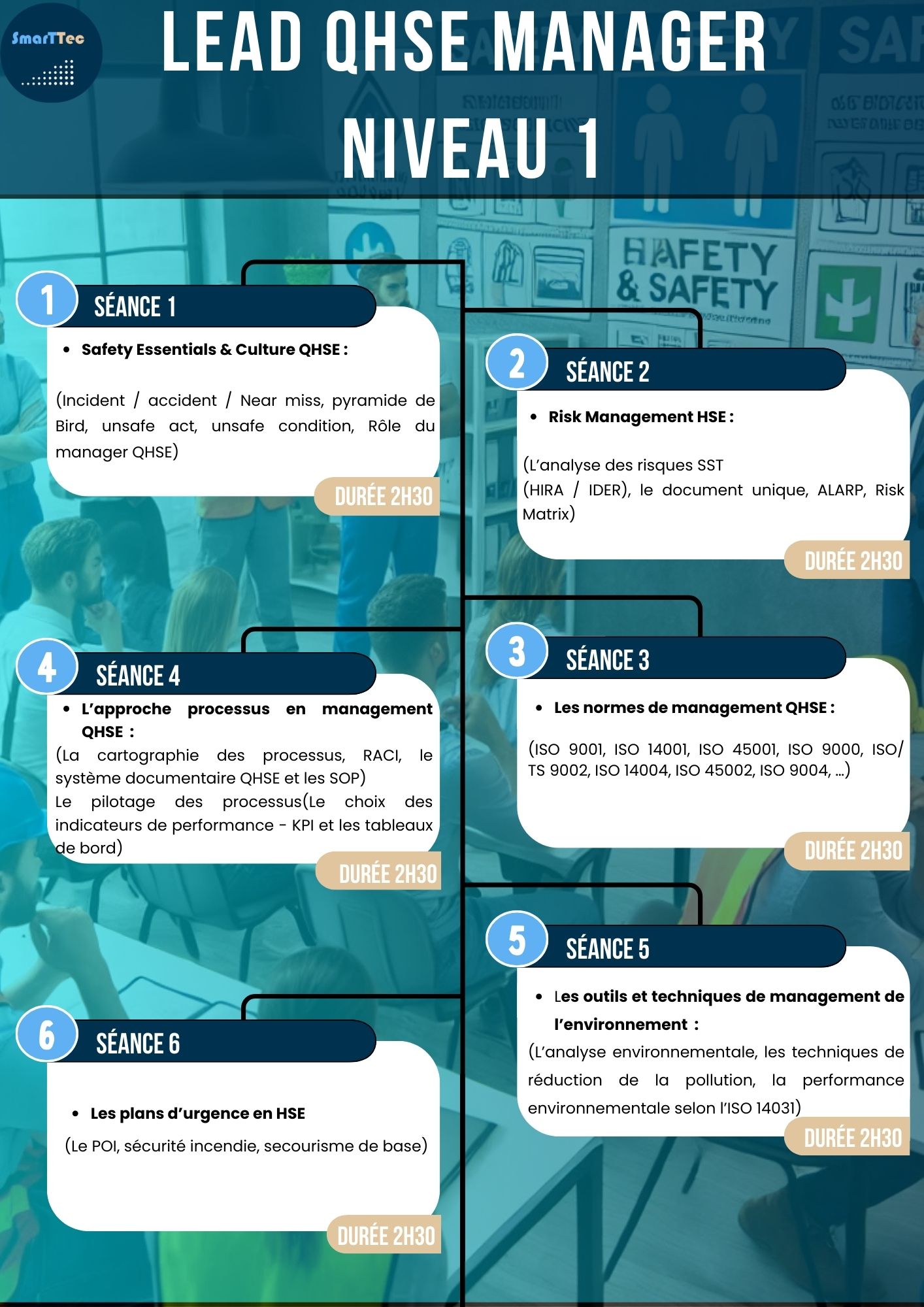 La formation certifiante Lead QHSE Manager Niv 1 est conçue pour préparer les professionnels à assumer des responsabilités clés dans la gestion de la Qualité, de l’Hygiène, de la Sécurité et de l’Environnement au sein des organisations.