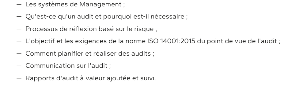 Elle permet à l’auditeur.rice de valider ses connaissances en ISO 14001 v 2015 et en management d’audit, et d’obtenir un certificat reconnu au niveau international. La formation couvrira .