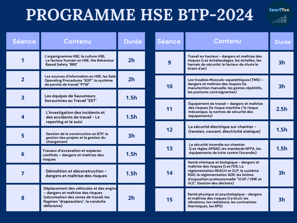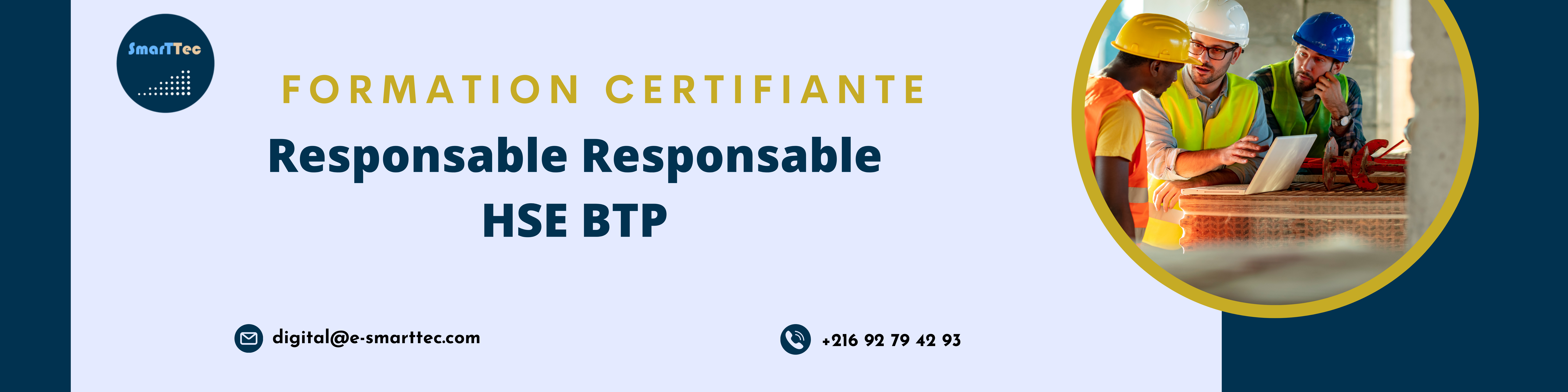 La formation de responsable HSE BTP vise à fournir les compétences nécessaires pour assurer la sécurité, la santé et la protection de l'environnement sur les chantiers de construction. Les objectifs incluent la connaissance des réglementations, l'identification des risques, la conception de plans HSE, la communication efficace, la gestion des incidents, l'audit des performances HSE et l'utilisation d'outils et de technologies HSE. L'objectif global est de former des professionnels capables de promouvoir une culture de sécurité et de contribuer à la réduction des accidents et à la protection de l'environnement dans le secteur du BTP.