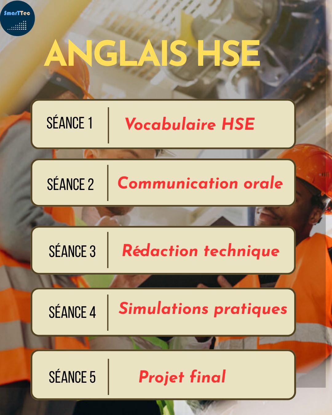 Cette formation est conçue pour renforcer les compétences en anglais appliqué au domaine de la Santé, Sécurité et Environnement (HSE). Elle permet aux participants de maîtriser le vocabulaire technique essentiel, de mieux communiquer dans un environnement professionnel international et de comprendre les documents, procédures et consignes HSE en anglais.