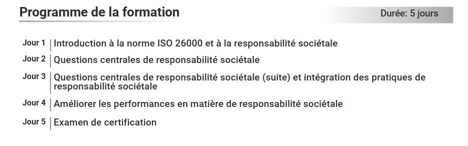 La formation PECB ISO 26000 Lead Manager met fortement l’accent sur le leadership éthique et les pratiques commerciales durables. Cette formation vous permet d'acquérir les connaissances et compétences nécessaires pour guider les organisations dans la planification, l'établissement, le maintien, la revue et l'amélioration continue de leurs initiatives stratégiques en matière de responsabilité sociétale, conformément aux lignes directrices de la norme ISO 26000 et à d'autres bonnes pratiques du secteur. Au cours de la formation, vous explorerez les concepts et principes fondamentaux de la responsabilité sociétale, en acquérant une compréhension approfondie de la manière de mettre en œuvre et d'intégrer efficacement ces principes dans les cadres organisationnels. Des exemples pratiques et des exercices basés sur des scénarios sont incorporés, garantissant que vous saisirez les concepts théoriques et que vous serez bien préparé à les appliquer dans des situations du monde réel. Après avoir suivi la formation avec succès, vous pouvez vous passer l'examen de certification pour obtenir la certification « PECB Certified ISO 26000 Lead Manager ». Cette certification prouve que vous possédez les connaissances et les compétences théoriques et pratiques nécessaires pour guider et diriger des organisations dans l'élaboration et l'amélioration de stratégies de responsabilité sociétale alignées sur les lignes directrices de la norme ISO 26000.