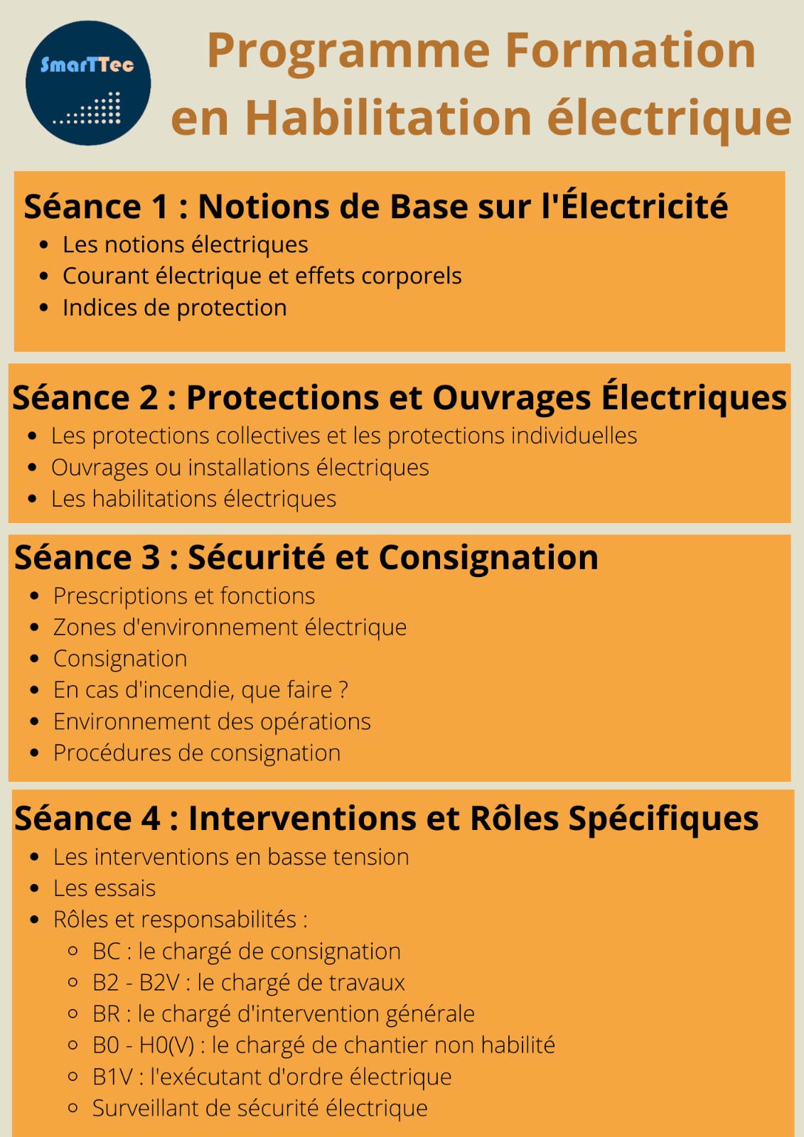 La formation en habilitation électrique a pour objectif de vous fournir les connaissances et compétences nécessaires pour travailler en toute sécurité sur les installations électriques. Vous apprendrez à reconnaître les dangers associés à l'électricité, à identifier les types d'habilitations et à respecter les normes de sécurité en vigueur.