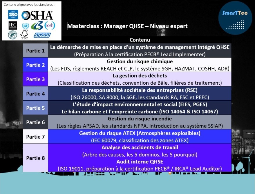 La formation certifiante de Responsable Qualité, Hygiène, Sécurité, Environnement (QHSE) est conçue pour préparer les professionnels à assumer des responsabilités importantes dans le domaine de la gestion de la qualité, de la sécurité, de l'hygiène et de l'environnement au sein d'une organisation.