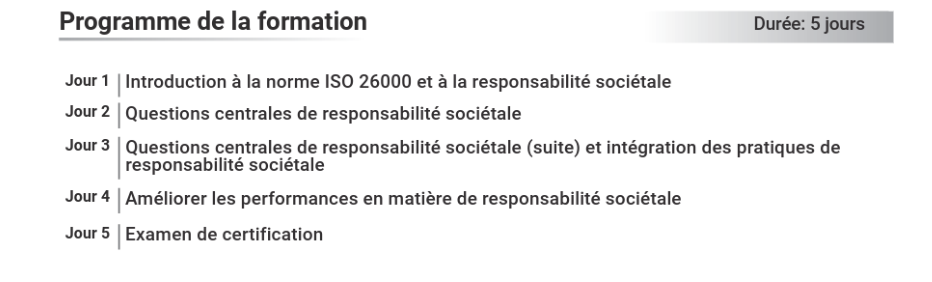 La formation PECB ISO 26000 Lead Manager met fortement l’accent sur le leadership éthique et les pratiques commerciales durables. Cette formation vous permet d'acquérir les connaissances et compétences nécessaires pour guider les organisations dans la planification, l'établissement, le maintien, la revue et l'amélioration continue de leurs initiatives stratégiques en matière de responsabilité sociétale, conformément aux lignes directrices de la norme ISO 26000 et à d'autres bonnes pratiques du secteur. Au cours de la formation, vous explorerez les concepts et principes fondamentaux de la responsabilité sociétale, en acquérant une compréhension approfondie de la manière de mettre en œuvre et d'intégrer efficacement ces principes dans les cadres organisationnels. Des exemples pratiques et des exercices basés sur des scénarios sont incorporés, garantissant que vous saisirez les concepts théoriques et que vous serez bien préparé à les appliquer dans des situations du monde réel. Après avoir suivi la formation avec succès, vous pouvez vous passer l'examen de certification pour obtenir la certification « PECB Certified ISO 26000 Lead Manager ». Cette certification prouve que vous possédez les connaissances et les compétences théoriques et pratiques nécessaires pour guider et diriger des organisations dans l'élaboration et l'amélioration de stratégies de responsabilité sociétale alignées sur les lignes directrices de la norme ISO 26000.