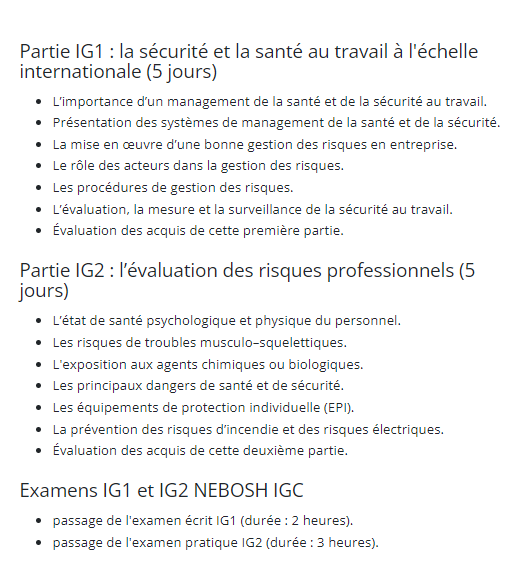 La certification NEBOSH International General Certificate in Occupational Health and Safety (IGC) est une qualification internationale de référence permettant d’acquérir des compétences solides en gestion de la santé et sécurité au travail. La formation couvre les principes de management HSE, l’identification des dangers, l’évaluation et la maîtrise des risques, ainsi que les bonnes pratiques internationales pour améliorer la performance sécurité au sein des organisations.